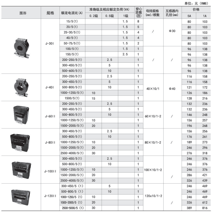 | 規(guī)格 | 額定電流比(A) | 準確級 | 穿心匝數(shù) | 母排規(guī)格/根數(shù) | |