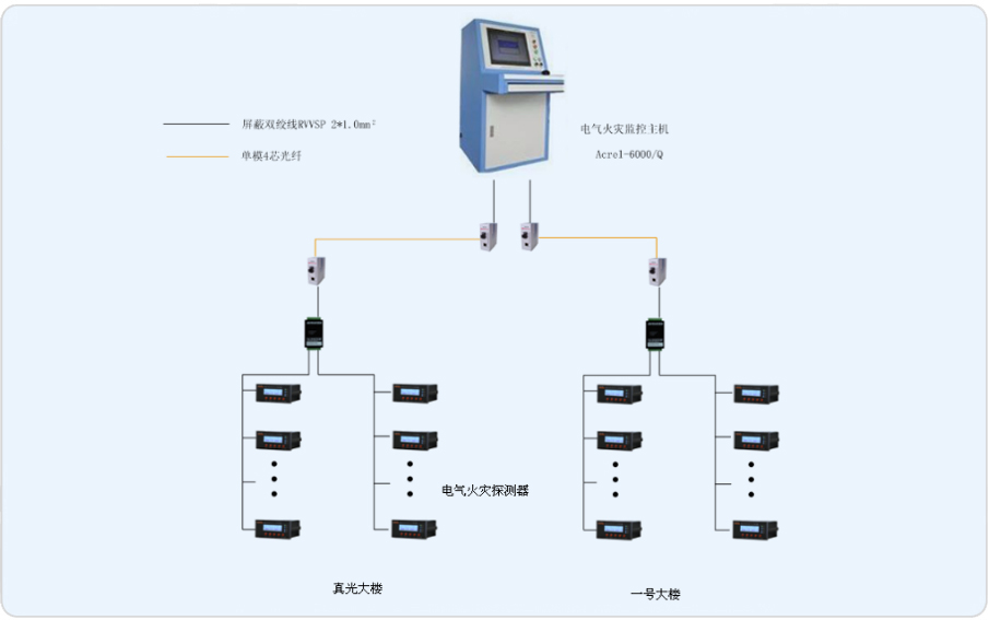 本期工程的監(jiān)控范圍主要為真光廣學大樓及新建一號樓,新建一號樓47個漏電流監(jiān)控裝置分布在B1~8F中,真光大樓33個漏電流監(jiān)控裝置分布在B1F~9F中,現(xiàn)為本項目設計一套Acrel-6000電氣火災監(jiān)控系統(tǒng),監(jiān)控裝置通過集線器及光纖至電氣火災監(jiān)控裝置,并由此來實時監(jiān)測商業(yè)樓內(nèi)重要回路的漏電流,以確保商業(yè)區(qū)配電系統(tǒng)的電氣安全。