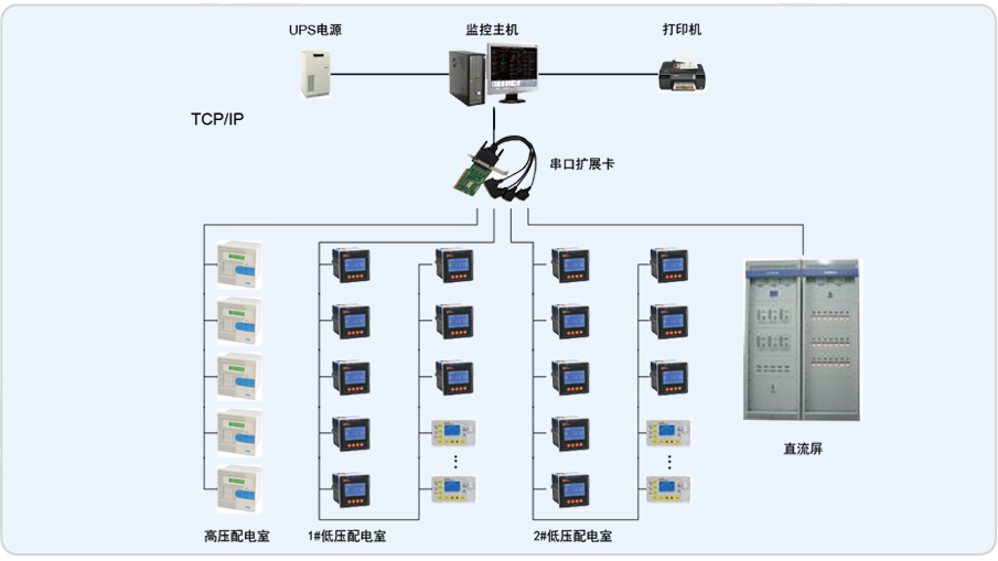 整個系統(tǒng)采用分布式結構,高壓配電室、低壓配電室1#、低壓配電室2#內(nèi)現(xiàn)場設備均采用RS485總線直接接入監(jiān)控主機擴展卡的串口。對于每個回路采用ACR多功能儀表,共126個回路;站控層應用國內(nèi)知名的聯(lián)想商用計算機作為監(jiān)控主機,同時設有用于報表打印輸出的打印機;防止異常斷電而引發(fā)的數(shù)據(jù)丟失的UPS設備。監(jiān)控軟件平臺采用單機版Acrel-3000型電能管理系統(tǒng)。Acrel-3000型電能管理系統(tǒng)預留了擴展接口,可方便進行擴展。