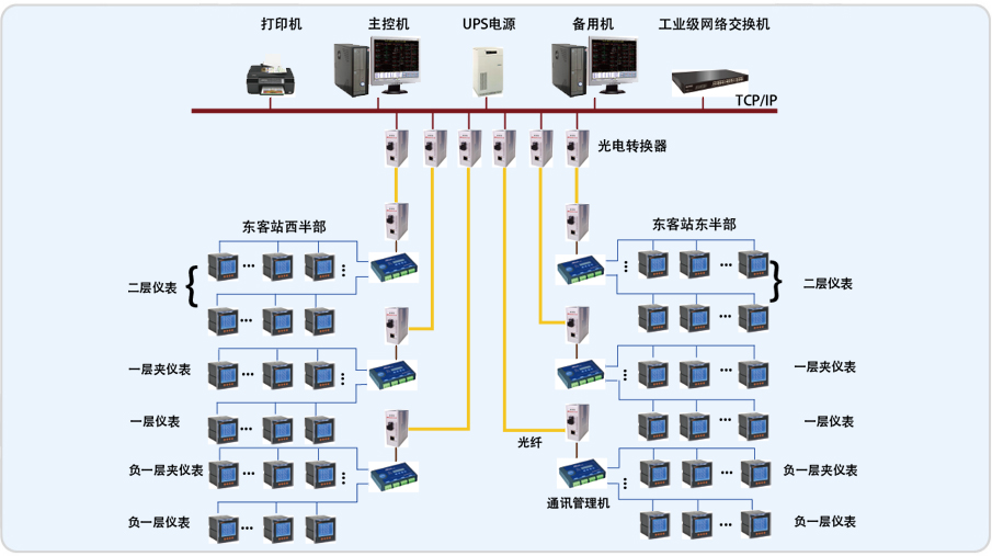 成都東客站電能管理系統(tǒng)采用雙機(jī)服務(wù),位于東客站一層西南角值班中心,同時(shí)該系統(tǒng)配有6臺(tái)管理機(jī),根據(jù)現(xiàn)場(chǎng)儀表的分布范圍,合理的分配6臺(tái)管理機(jī)的管理范圍;為保障數(shù)據(jù)傳輸?shù)膶?shí)時(shí)性和穩(wěn)定性,均采用光纖進(jìn)行數(shù)據(jù)上傳。在值班室對(duì)管理機(jī)上傳的數(shù)據(jù)進(jìn)行多樣式表現(xiàn)方式,畫(huà)面比較形象直觀;系統(tǒng)同時(shí)具備向BA系統(tǒng)轉(zhuǎn)發(fā)數(shù)據(jù)的功能。