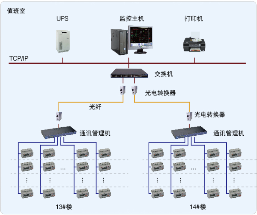 該項目有兩棟樓,均為六層,一共有532個房間,其中13#棟彝學院289個房間,14#棟藏學院243個房間,采用我司ADF100單相多用戶電能表195個,分為24條RS485總線接至通訊管理機,通訊管理機通過光纖拉至值班室連接到Acrel-3000預付費電能管理系統(tǒng)后臺,實現(xiàn)總線上儀表與監(jiān)控主機的數(shù)據連通。該系統(tǒng)為學校宿舍項目解決用電問題提供了真實可靠的依據,取得了較好的管理水平。