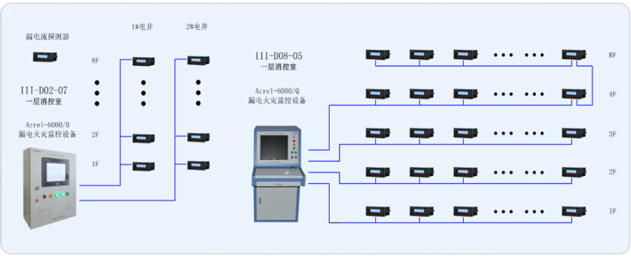 三湘廣場由III-D02-07地塊和III-D08-05地塊各自一獨棟商業(yè)建筑組成。為了確保本地塊的樓宇的電氣安全,現在樓層內的配電箱進線端安裝安科瑞品牌ARCM系列漏電流探測器,由此來實時監(jiān)測變電所內重要回路的漏電流,并在III-D02-07地塊和III-D08-05地塊消控室內安裝ACREL-6000電氣火災監(jiān)控設備,以確保變電所配電系統(tǒng)的電氣安全。