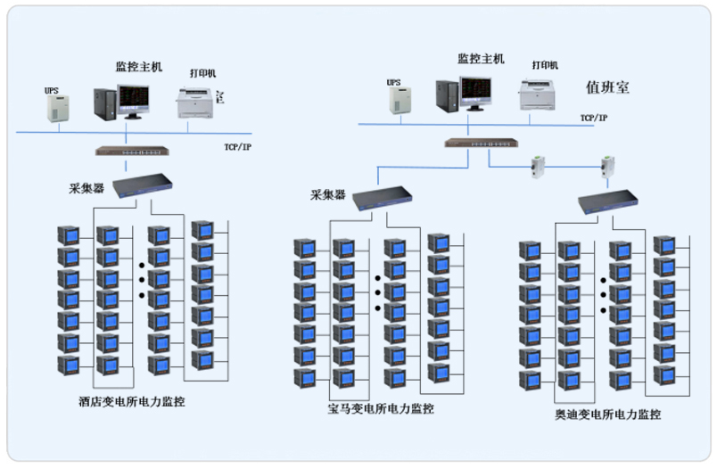 本項目根據管理區(qū)域設置兩套Acrel-2000型電力監(jiān)控系統(tǒng),系統(tǒng)采用網絡分布式結構,其中寶馬奧迪主機設置在地下配電值班室,酒店設置在一樓值班室。所有配電回路均配備安科瑞電力儀表PZ系列。該項目實現了3個變電所內電力系統(tǒng)的智能管理。所有監(jiān)控設備均通過屏蔽雙絞線至各自配電室內的通訊管理機,從而實現遠程監(jiān)控。